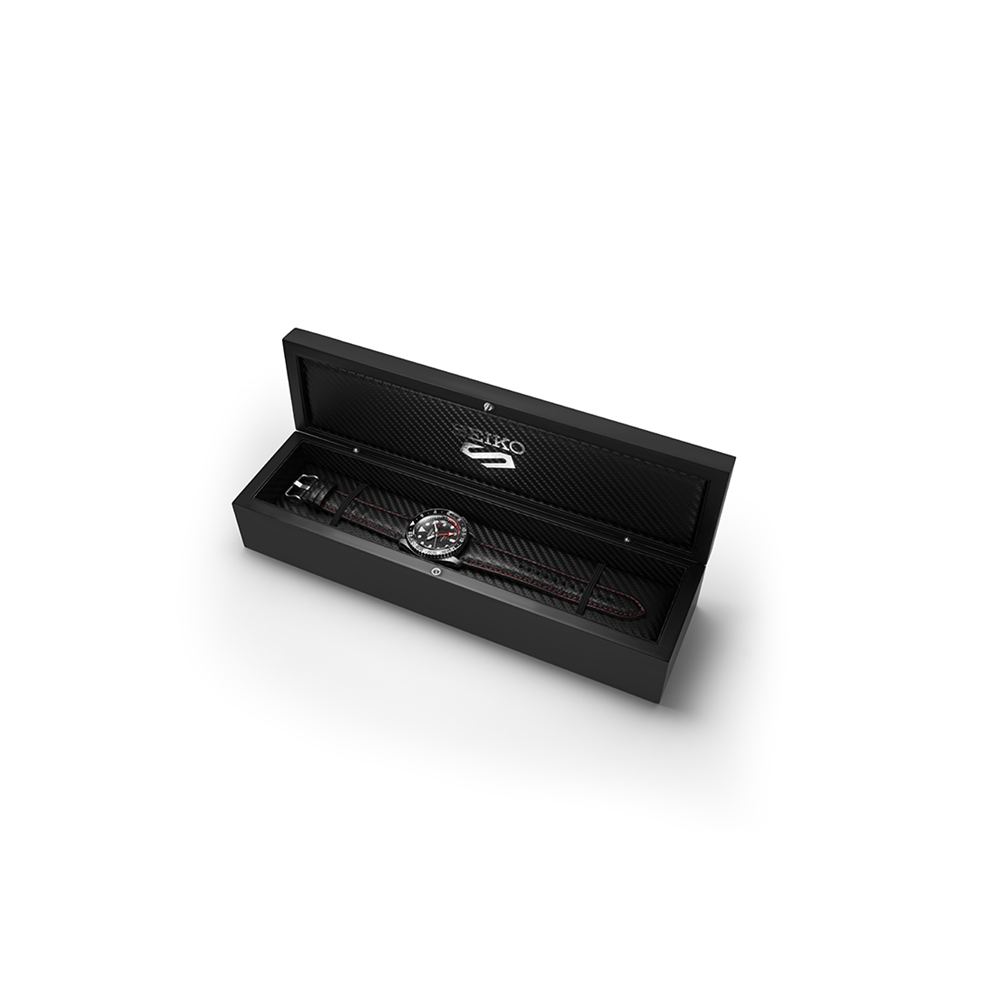 Laten we beginnen met het meest voor de hand liggende hoogtepunt: het ontwerp, dat sterk leunt op de raceopdracht. Een wijzerplaat met koolstofvezelpatroon zet de toon en verwijst naar de lichtgewicht materialen die in moderne raceauto's worden gebruikt, terwijl rode accenten de binnenste cijferring, GMT wijzer en secondewijzer accentueren, waarbij Lumibrite op de wijzers en uurmarkeringen zorgt voor leesbaarheid bij weinig licht. Het Supercars-logo is gegraveerd op zowel de kroon als de achterkant van de kast, waarop ook het individuele limited-edition nummer van elk horloge staat.