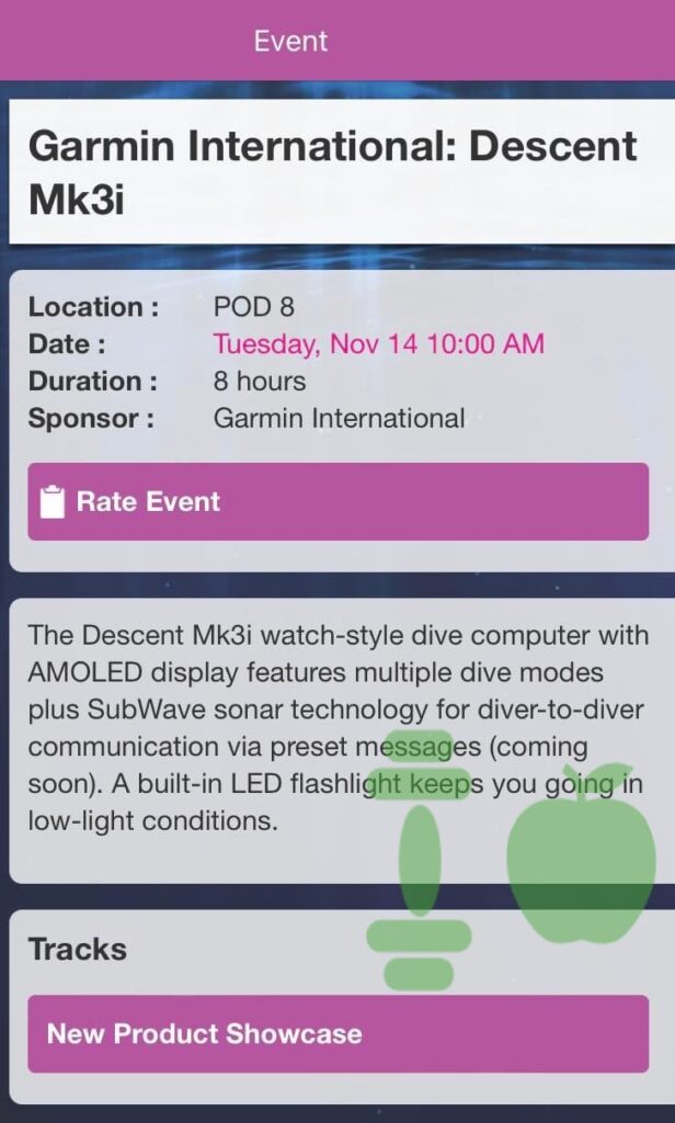 Een nieuwe afbeelding (hieronder) die is opgedoken door Gadgets & Wearables suggereert dat Garmin van plan is om de nieuwe smartwatch te onthullen tijdens een evenement op 14 november. De preview van het evenement noemt de Descent Mk3i en beschrijft het als een "horloge-stijl duikcomputer". De gadget zou een AMOLED-scherm hebben, een upgrade van het MiP-display van de Mk2-serie, en een geïntegreerde LED-zaklamp die u helpt te zien bij minder licht. Er worden meerdere duikmodi genoemd, evenals de SubWave sonartechnologie, die al in het vorige lek werd genoemd.