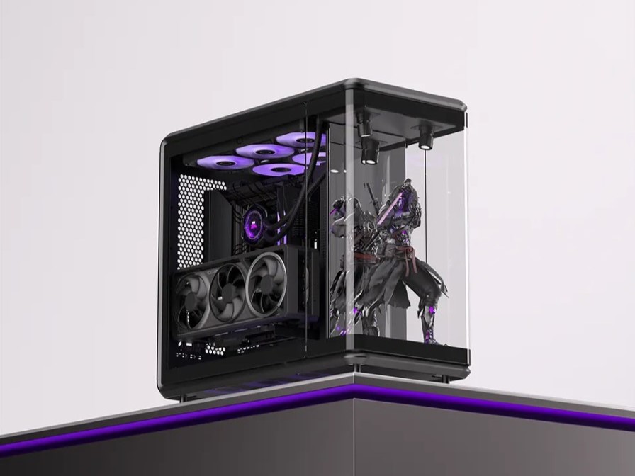 Tot slot hebben we de MasterFrame 360 Stage LCD, die ook een open ruimte aan de voorkant heeft voor figuurtjes. Maar in plaats van een spiegel zit er een groot 15,6 inch LCD-scherm achter het displaygedeelte. Dit scherm ondersteunt Full HD (1080 x 1920) resolutie en kan aangepaste video's, afbeeldingen, systeemstatistieken of animaties weergeven.