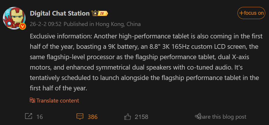 Digital Chat Station, een betrouwbare tipgever op Weibo, heeft een rapport gedeeld over een krachtige gamingtablet die in H1 (eerste helft) van 2026 gelanceerd zal worden. Naar verluidt wordt het een concurrent voor de aankomende 2026 Legion tab, die Lenovo onlangs heeft geplaagd.