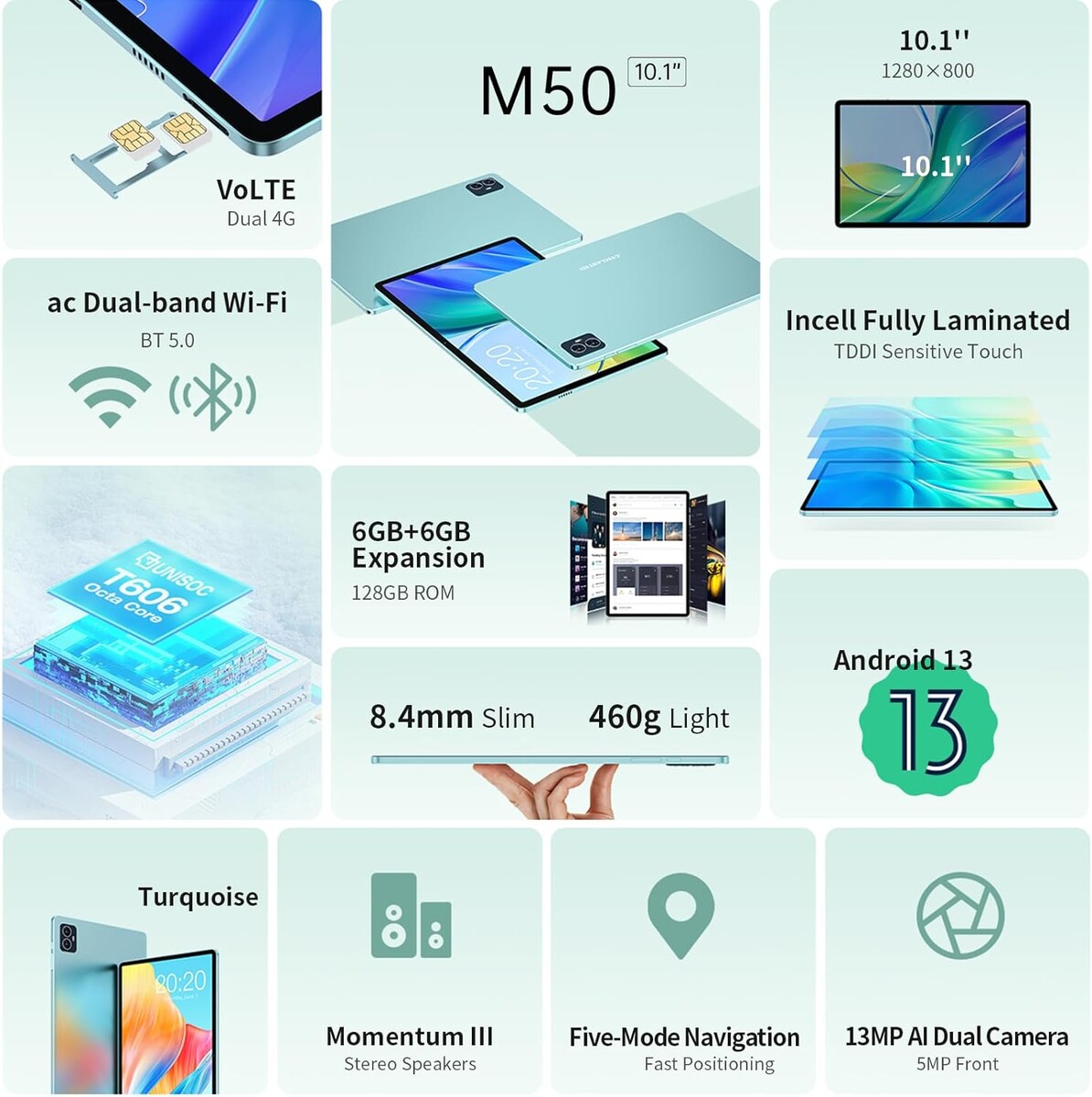 Het beeldscherm van de Teclast M50 heeft een diagonaal van 10,1 inch en is daarmee vergelijkbaar met een klassieke iPad. De resolutie van het IPS-paneel is 1.280 x 800 pixels. Dankzij de LTE-connectiviteit is de tablet niet afhankelijk van een Wi-Fi-netwerk om online te zijn als er een SIM-kaart is geplaatst, maar kan natuurlijk ook dual-band Wi-Fi gebruiken. Er is ook Bluetooth 5.0, Widevine L1 ondersteuning, GNSS en twee luidsprekers. De betaalbare tablet met een slanke metalen behuizing van 8 mm is verkrijgbaar in het groen en heeft Android 13 als besturingssysteem.
