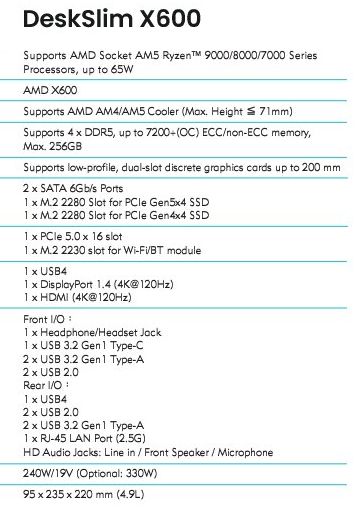 Het specificatieblad suggereert dat de mini PC ondersteuning heeft voor CPU's tot 65W TDP, waardoor high-end opties zoals de Ryzen 7 9800X3D uit de compatibiliteitslijst verdwijnen. Er is ondersteuning voor een low-profile, dual-slot discrete GPU, waardoor de DeskSlim X600 een goede keuze zou kunnen zijn voor degenen die geïnteresseerd zijn in het bouwen van een compacte Steam Machine-achtige gaming PC willen bouwen.