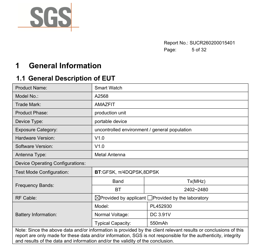 De Amazfit A2568 bevat bijvoorbeeld een 550 mAh batterij. Deze capaciteit is meer dan 60% groter dan de 340 mAh batterij in de Bip 6, waardoor de A2568 waarschijnlijk niet de Bip 7 kan zijn. Hetzelfde geldt voor de Active 2 Square, waarvan de batterij meer dan 50% kleiner is dan die van de A2568.