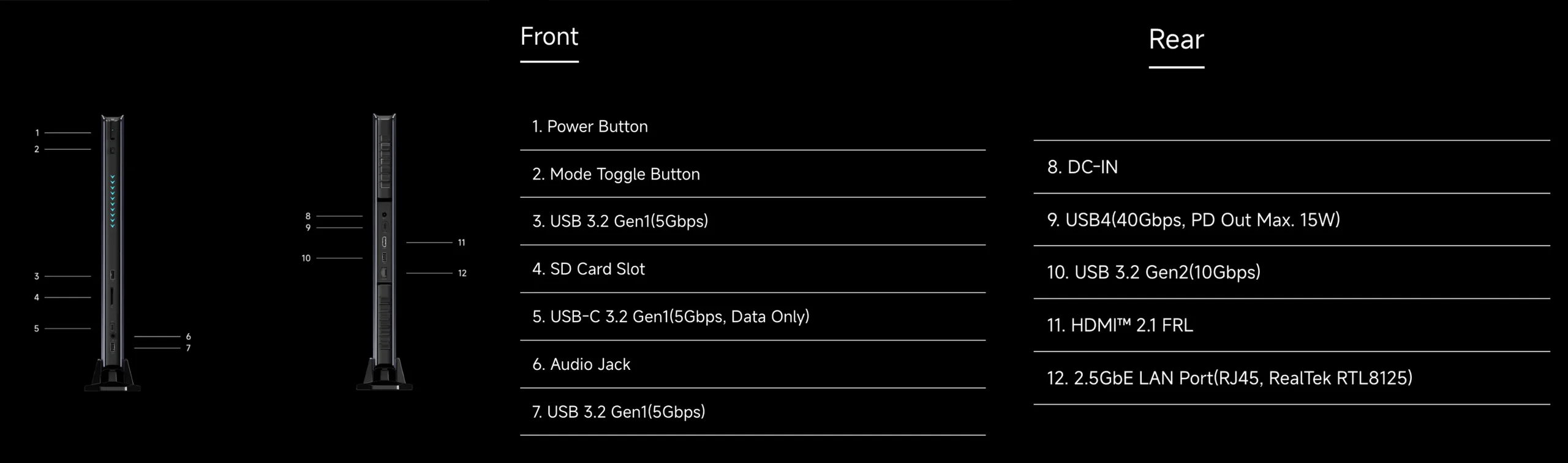 De AtomMan G7 Pro zit ook niet verlegen om poorten, zoals de afbeelding hierboven laat zien. Minisforum heeft zijn nieuwste mini-pc geprijsd voor $1.359,90 als een barebones unit voor degenen die hun eigen RAM en opslag willen meenemen, waarvan de AtomMan G7 Pro tot 96 GB DDR5-5200 en 8 TB verdeeld over twee M.2 2280-slots ondersteunt. Als alternatief verkoopt Minisforum ook een voorgeconfigureerde eenheid met 32 GB RAM en 1 TB opslag voor $1.679,90.