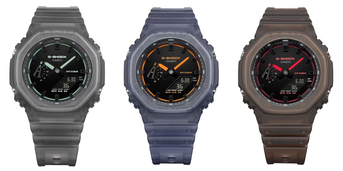 Casio's G-Shock GA-2100K zijn geïnspireerd op nachtclubs en muziekfestivals, met een rookachtige afwerking op de transparante harsbehuizing en band. De neonaccenten staan voor de laserverlichting die vaak in deze omgevingen wordt gebruikt. De GA-2100K-1A is grijs met turquoise accenten, de GA-2100K-2A is blauw met oranje accenten en de GA-2100K-5A is bruin/oranje met rode accenten.