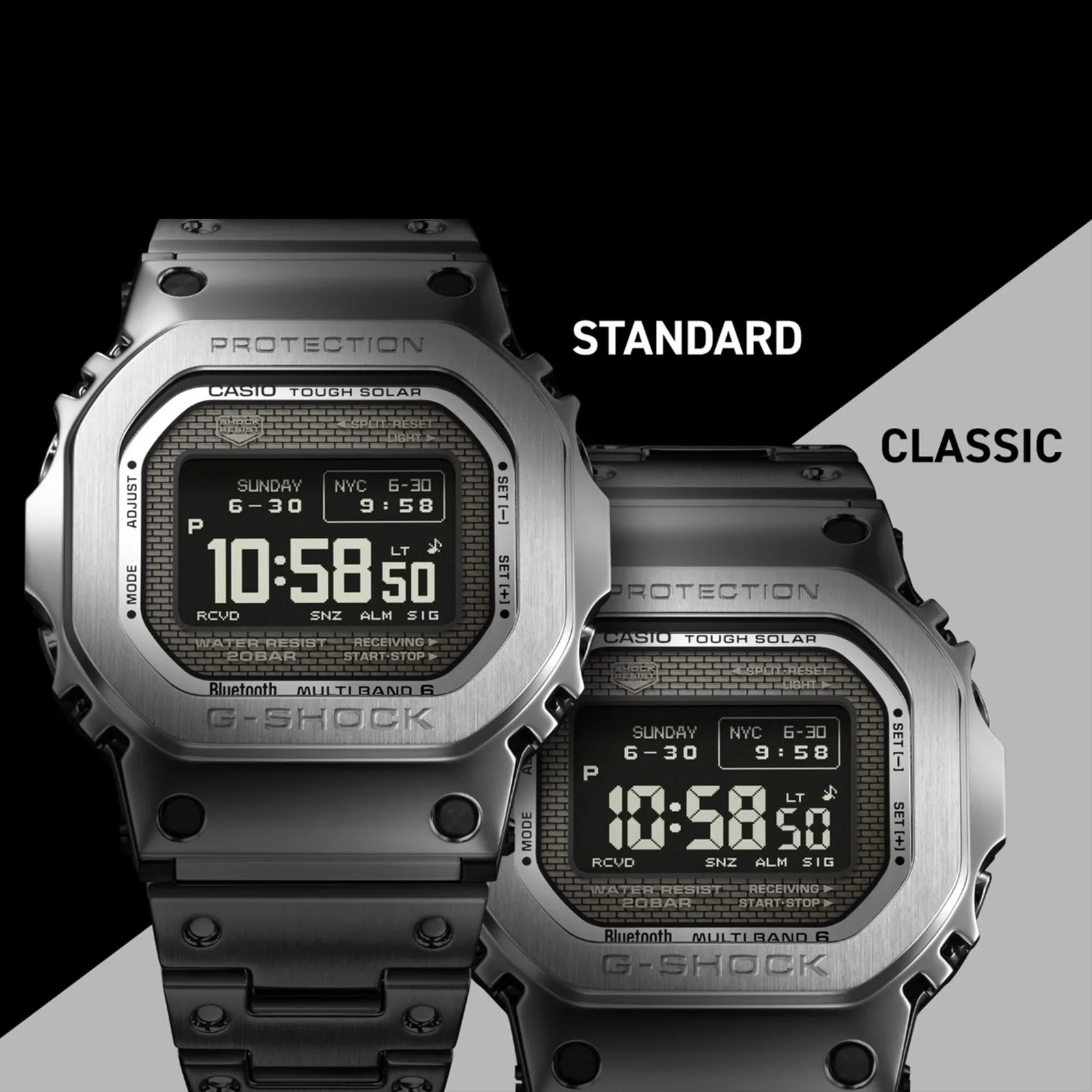 Technisch gezien is dit het eerste volledig metalen vierkant met een hoogcontrast memory-in-pixel (MIP) LCD-scherm, voor een scherpere, flexibelere digitale lay-out dan voorgaande G-SHOCK vierkanten, inclusief meerdere tijdweergaveconfiguraties en schakelbare lettertypes (Standaard of Classic in 7-segmenten stijl) via de bijbehorende app. Onder de motorkap krijgen kopers de standaard G-Shock horloge specificaties: 20 bar waterdichtheid, Tough Solar opladen, schokbestendige constructie, Bluetooth Smartphone Link, Multiband 6 radiobesturing, wereldtijd, stopwatch, afteltimer, vijf alarmen en een volledig automatische LED-achtergrondverlichting.