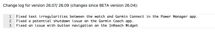 Voor de rest is het wijzigingslogboek voor de Fenix 7 bètaversie 26.09 vrijwel identiek. Er staan drie bugfixes in, waarvan er één een probleem met de Power Manager app aanpakt, waarbij de tekst op het horloge niet overeenkwam met de tekst in de Garmin Connect app. Een probleem dat ervoor kon zorgen dat deze smartwatches uitvielen bij gebruik van de Garmin Coach app is opgelost, evenals onregelmatigheden in de vaste tekst tussen het horloge en Garmin Connect in de Power Manager app. Bovendien zou een bug in verband met knopnavigatie voor de InReach Widget verholpen zijn.