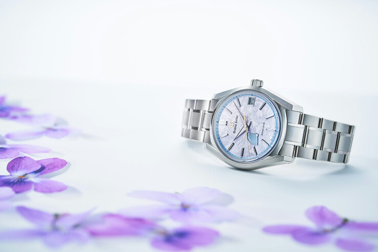 Het kleurenpalet verwijst naar de "Sumire" (violette) bloem. De wijzerplaat heeft een zachte violetgrijze tint, naast een blauwe gangreserve-indicator en een blauwe omtrekring. Dankzij de goudkleurige elementen, waaronder het GS-logo en de secondewijzer, krijgen we een scherp contrast met het gestructureerde "Hana-ikada" patroon, dat bedoeld is om kersenbloesems na te bootsen die op het water drijven.