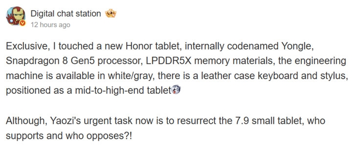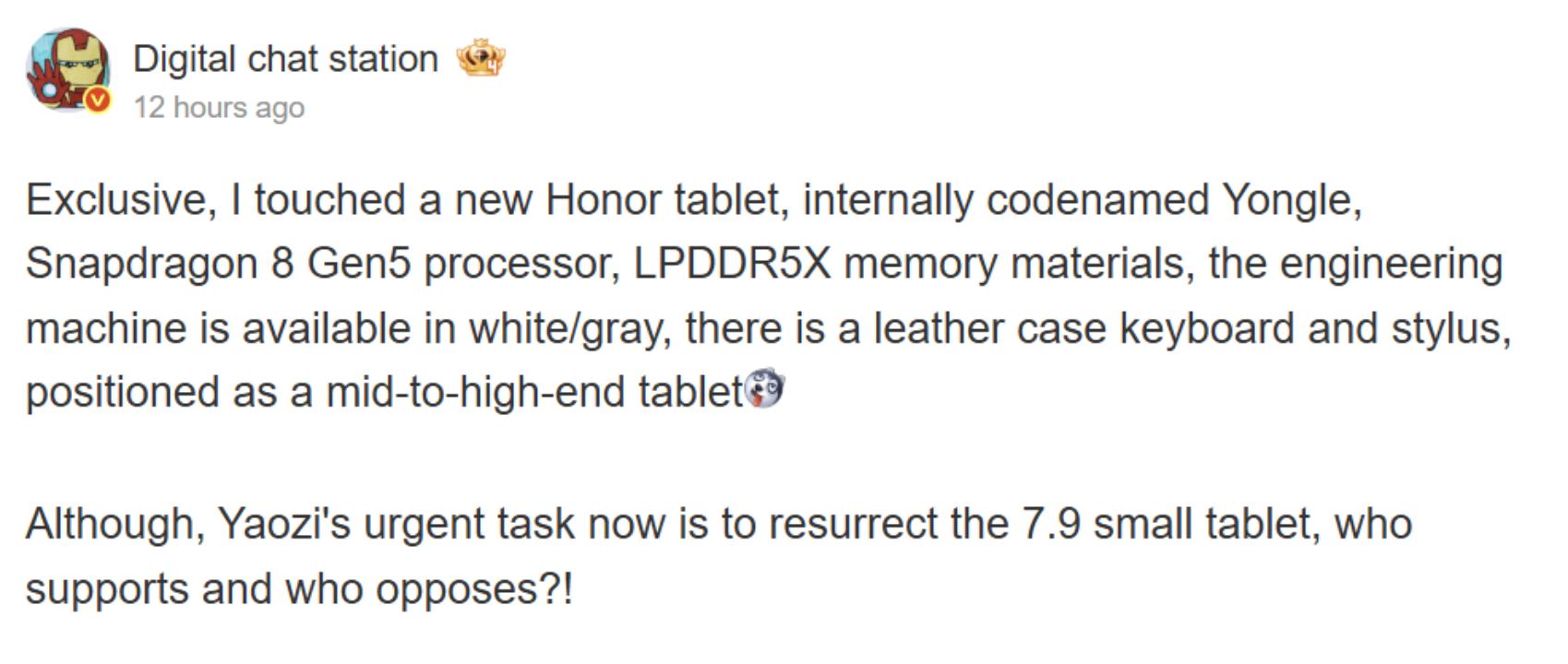 Zoals de onderstaande screenshot laat zien, geeft Digital Chat Station de naam van de nog niet uitgebrachte Honor tablet niet door. In plaats daarvan verwijzen ze naar de codenaam, Yongle. Desalniettemin geeft de chipset in kwestie aan dat "Yongle" de MagicPad 3 of de Pad GT2 Pro zal vervangen in plaats van de MagicPad 3 Pro. Er wordt gezegd dat Honor de 'Yongle' heeft uitgerust met de Snapdragon 8 Gen 5 die ten grondslag ligt aan de OnePlus 15R (momenteel $699,99 op Amazon).