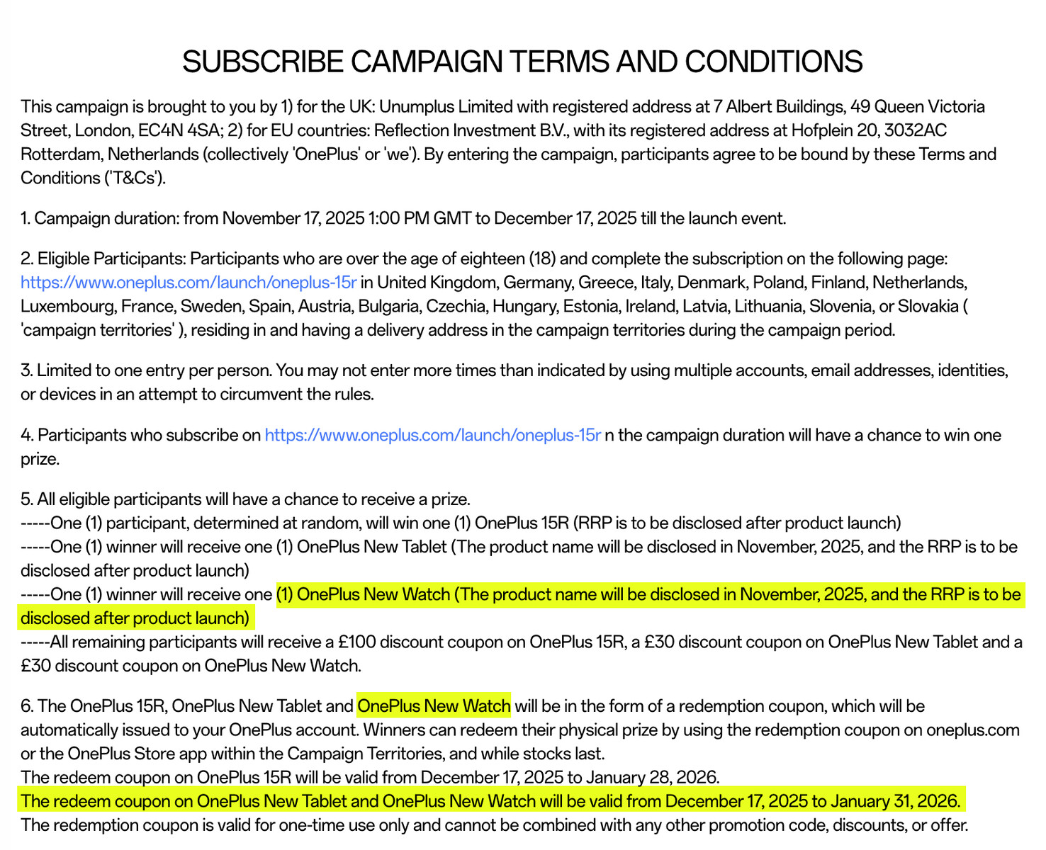 Naast deze apparaten bereidt OnePlus zich ook voor op de lancering van een nieuwe smartwatch op tijd voor de feestdagen. Op dit moment heeft het bedrijf alleen bevestigd dat de 'OnePlus New Watch' er 'binnenkort aankomt'. Hoewel de naam van het apparaat vooralsnog onbekend blijft, bevestigen de voorwaarden van de nieuwste lanceringscampagne van het bedrijf dat het de productnaam van de OnePlus New Watch later deze maand zal onthullen.