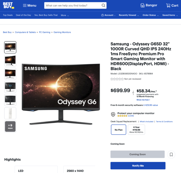 Ook draait de Odyssey G65D op Tizen en bevat het een kleine USB-hub, samen met DisplayPort 1.4 en HDMI 2.1 poorten. Verwarrend genoeg vermeldt Best Buy in sommige gevallen dat de Odyssey G65D een IPS-paneel gebruikt, wat een aanzienlijke verandering zou zijn ten opzichte van de op VA gebaseerde Odyssey G65B. Het vermeldt echter VA als het paneeltype van de Odyssey G65D op het paneel met de belangrijkste specificaties. Daarom is het in dit stadium onduidelijk hoe Samsung de Odyssey G65B en Odyssey G65D van elkaar heeft onderscheiden. Best Buy heeft nog geen releasedatum gedeeld, hoewel het mogelijk is om u aan te melden voor wanneer de Odyssey G65D beschikbaar komt.