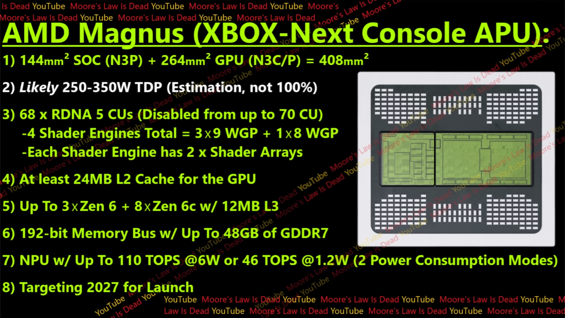 De GPU zal worden geproduceerd op TSMC's N3P- of N3C-node, terwijl de SoC op TSMC N3P zal zijn. De CPU wordt geleverd met een 11-core CPU met drie Zen 6-kernen en acht Zen 6c-kernen. Tom geeft aan dat het cijfer voorlopig is en dat sommige van deze kernen uitgeschakeld kunnen worden. Tot slot wordt de Xbox Magnus ook geleverd met een NPU voor AI-taken op het apparaat.