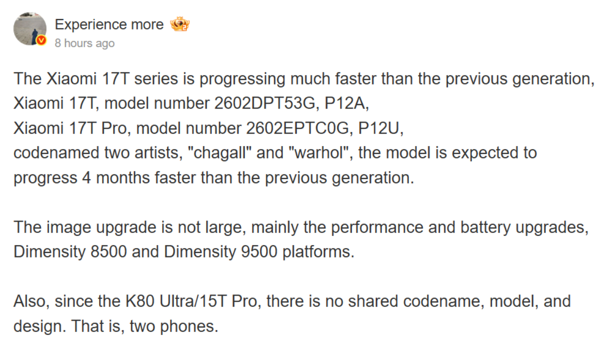 In plaats daarvan beweren ze dat de Xiaomi 17T Pro en Redmi K90 Ultra twee verschillende smartphones zijn. Schrijvend op Weibo verwacht Experience more dat zowel de Xiaomi 17T Pro als de Xiaomi 17T "vier maanden vooruitlopen op de vorige generatie". Daarom is het mogelijk dat we de Xiaomi 17T-serie halverwege tot eind mei 2026 wereldwijd zien debuteren in plaats van in september 2026.