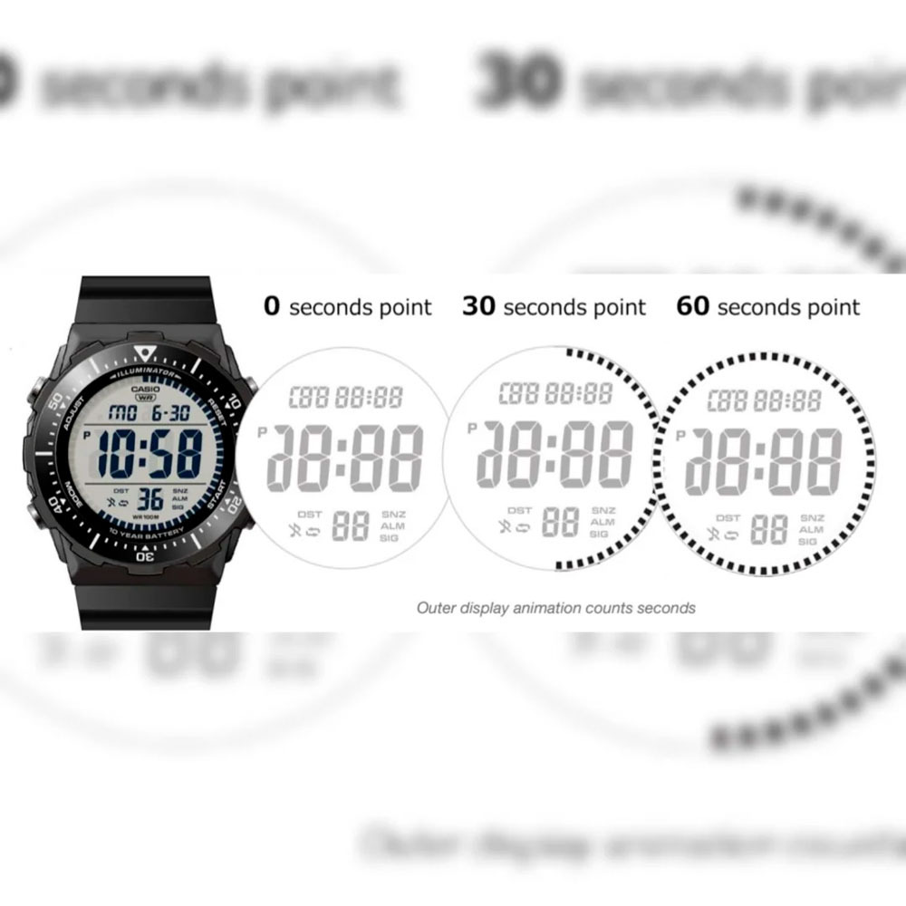 De belangrijkste functies zijn een dubbele tijdsweergave, 24-uurs chronograaf, afteltimer met automatische herhaling, alarm, uursignaal, automatische kalender, amberkleurige LED-achtergrondverlichting en 100 meter waterdichtheid. De digitale display heeft ook een mooie geanimeerde secondeteller op de buitenste ring. Het kristal is van plastic en de band en kast zijn van hars gemaakt voor de duurzaamheid.