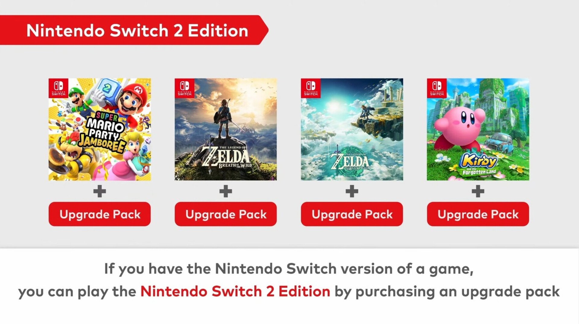 Een van de vragen in de aanloop naar de Nintendo Direct was de geruchtmakende Switch 2 Edition-spellen. Dankzij de achterwaartse compatibiliteit van de nieuwe console zouden veel Switch-titels moeten werken. Nintendo richtte zich echter meer op Switch 2 Upgrade Packs. Bepaalde games zoals The Legend of Zelda: Breath of the Wild en Super Mario Party Jamboree zullen deze optie hebben. Deze titels zouden ten volle profiteren van de verbeterde specificaties van de Switch 2, met mogelijk hogere beeldsnelheden.