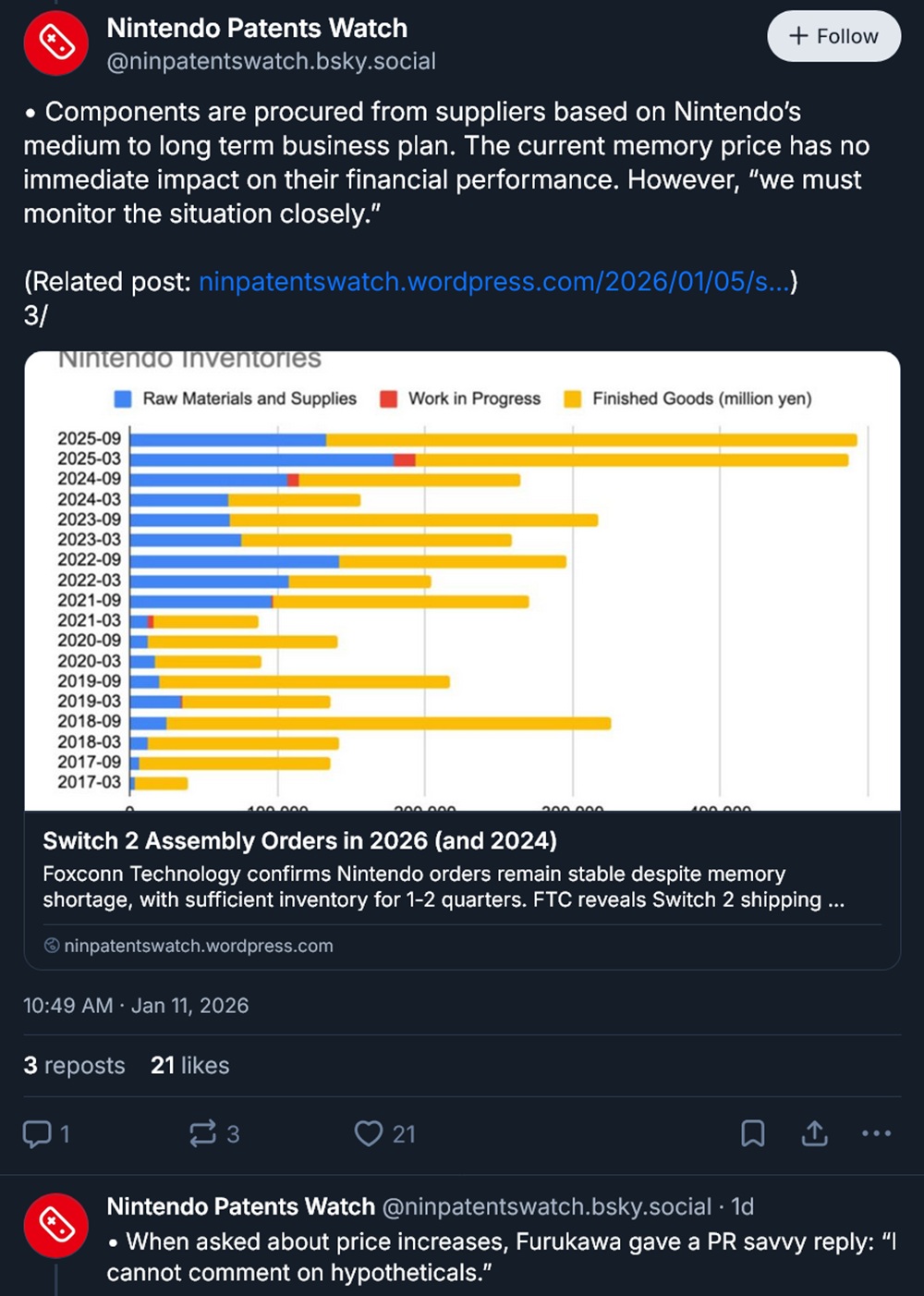Ongekende geheugenprijzen drijven de kosten van gaming-pc's op, maar ook consoles worden bedreigd. Kyoto Shimbun (paywalled) vroeg Nintendo President Shuntaro Furukawa naar de mogelijke gevolgen voor de nieuwste handheld van het bedrijf. De Patents Watch Bluesky account vertaalde enkele belangrijke punten, waaronder een vraag over een Switch 2 prijsverhoging.