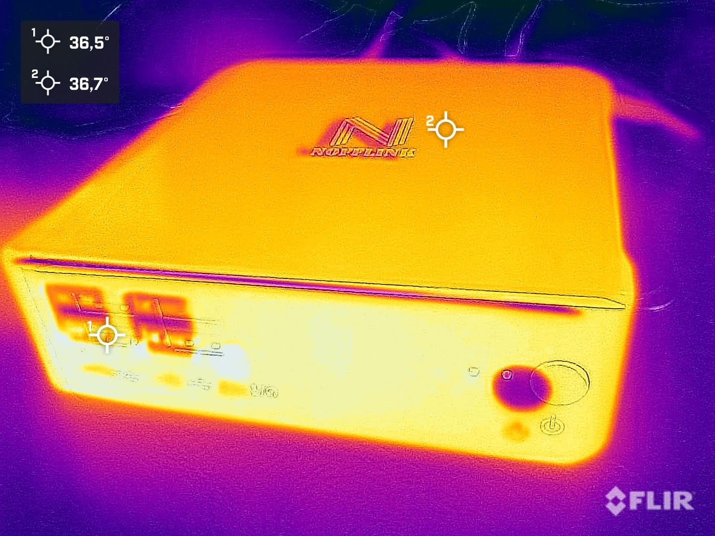 Onze eerste belastingstesten resulteren in een gunstige indruk van de koeling van de SoC. Dat gezegd hebbende, de koeloplossing van de Intel Pentium Gold 5405U zit aan zijn limiet in ons extreme belastingsscenario. HWiNFO meldt thermische throttling, wat suggereert dat Nofflink de maximum temperatuur van de SoC heeft gedefinieerd op ongeveer 80 °C (176 °F). Zonder limieten ingesteld door de fabrikant, laat de Intel Pentium Gold 5405U tot 100 °C (212 °F) toe. Gemiddeld daalt de CPU klok wanneer zowel de CPU als de iGPU worden belast tot slechts 1,2 GHz. Dit is een gevolg van het beperkte stroombudget van 10 watt, dat de CPU en iGPU moeten delen.