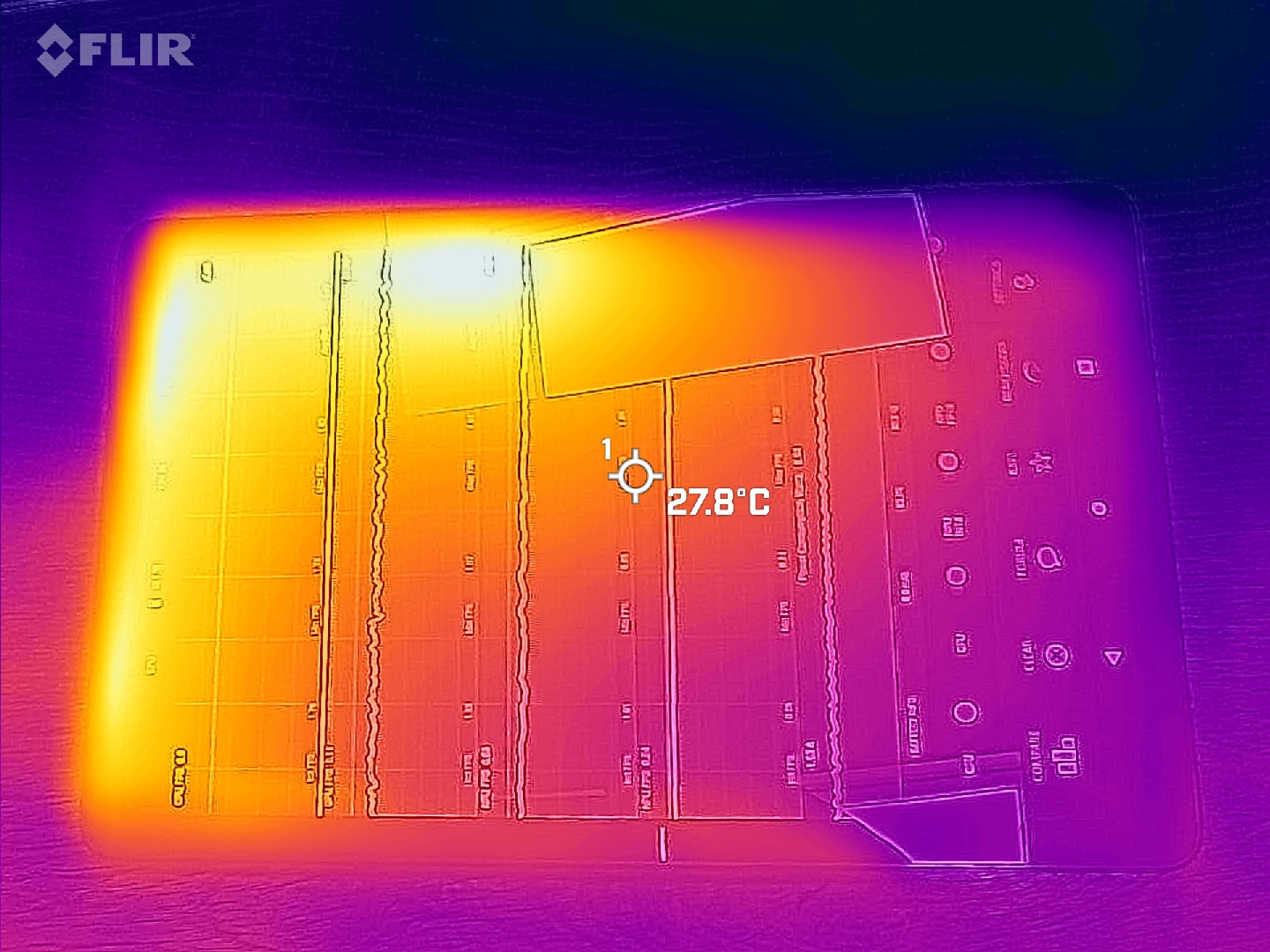 (+) De maximumtemperatuur aan de bovenzijde bedraagt 33.4 °C / 92 F, vergeleken met het gemiddelde van 33.7 °C / 93 F, variërend van 20.7 tot 53.2 °C voor de klasse Tablet.