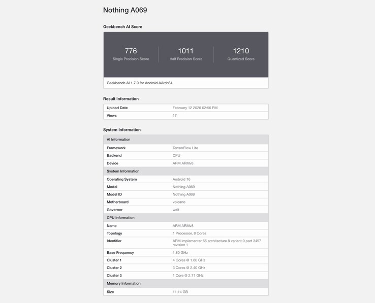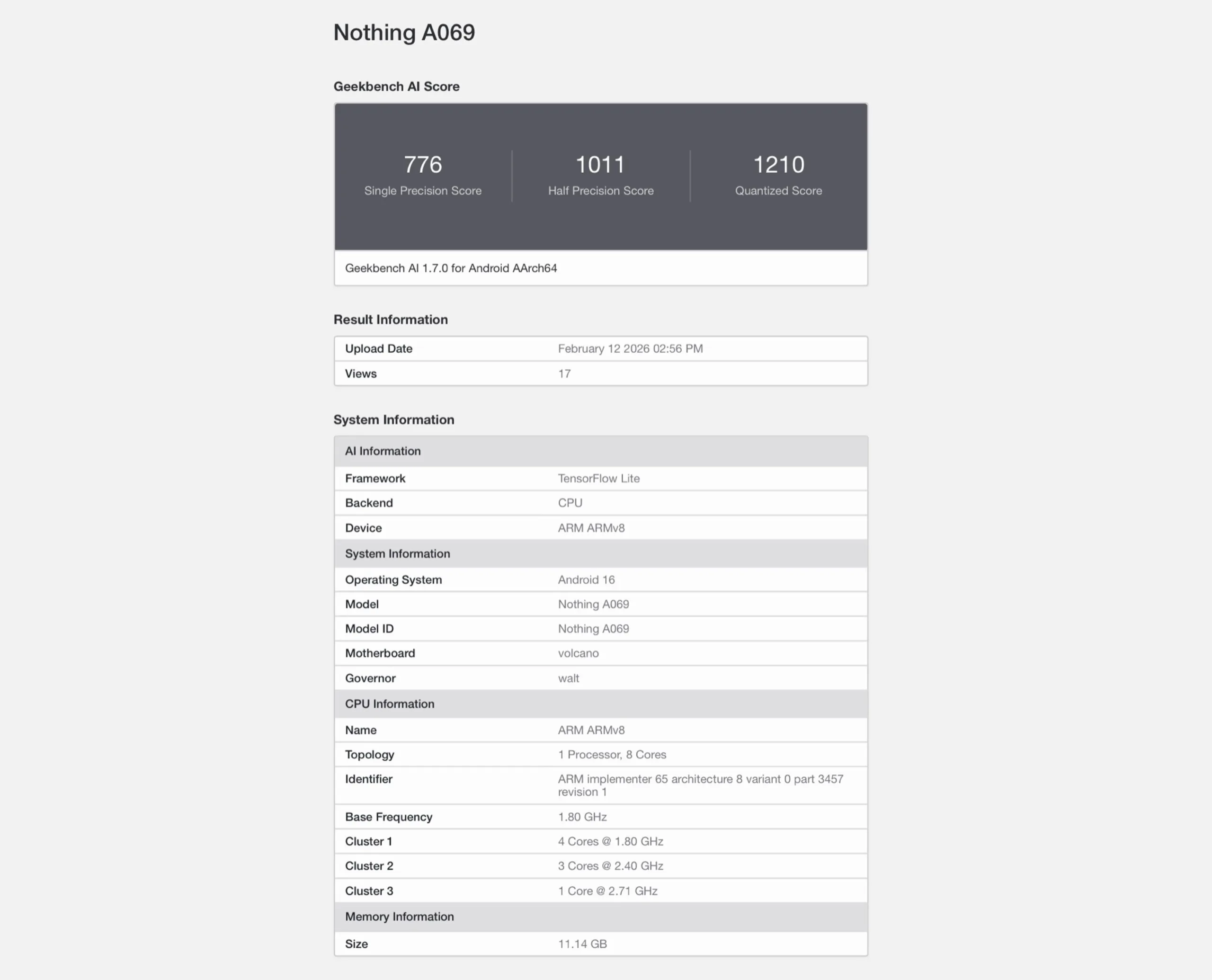 Ondertussen is de Nothing Phone (4a) Pro al op Geekbench verschenen. De vermelding suggereert dat de smartphone uit het middensegment wordt aangedreven door de Qualcomm Snapdragon 7s Gen 4. De 4 nm-chipset van vorig jaar heeft één ARM Cortex-A720 prime core met boost-klokken tot 2,7 GHz, drie Cortex-A720 performance cores geklokt tot 2,4GHz, en vier Cortex-A520 efficiency cores die draaien op 1,8 GHz. De telefoon die op Geekbench is verschenen heeft 12GB RAM.