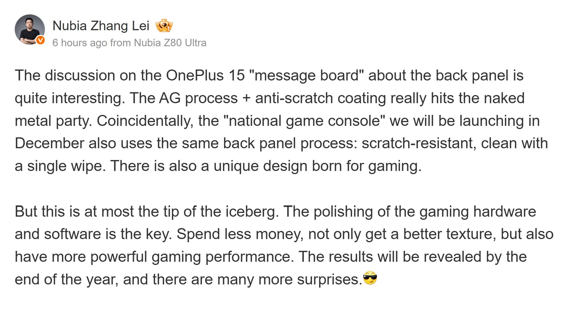 Zhang voegt eraan toe dat Nubia werkt aan een betaalbare gamingtelefoon die dezelfde achterpaneeltechnologie zal gebruiken. Wat nog belangrijker is, is dat de General Manager van Nubia verklaart dat het toestel beter geschikt zal zijn voor gamers dan de OnePlus 15 (Chinees 256 GB momenteel $693,54 op TradingShenzhen), omdat het zowel met software- als hardware-optimalisaties voor games zal worden geleverd.
