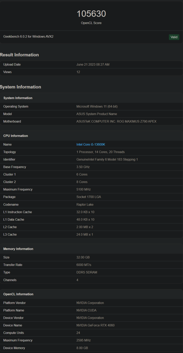 Hij scoort 105.630 in Geekbench's OpenCL benchmarken is daarmee ongeveer 18% sneller dan de GeForce RTX 3060 (89.000). De dingen zijn niet veel anders in Vulkanwaar de GeForce RTX 4060 99.419 punten haalt, waarmee hij ruwweg 17% sneller is dan zijn voorganger. Het bevestigt ook een aantal GeForce RTX 4060 specificaties, waaronder 24 SM's (Streaming Multiprocessors) en 8 GB GDDR6 geheugen.