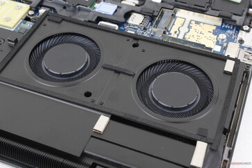 Het onderpaneel wordt vastgezet met zes Philips-schroeven voor eenvoudig onderhoud. De interne onderdelen zijn vergelijkbaar met de slankere Precision 7670, met uitzondering van de verschillen in batterijcapaciteit, het aantal beschikbare opslagplaatsen en de aanwezigheid van een klein koellichaam.