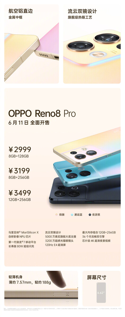 Maar de Reno8-serie is wel voorzien van NFC, ColorOS 12.1 en OPPO HYPERBOOST voor mobiele gaming optimalisatie over de hele linie. Ze beginnen bij 2.499 yuan (~$ 376) voor een 8GB RAM/128GB interne opslag 8-eenheid en top uit op 3.999 yuan (~ $ 601) voor een 12GB/256GB Pro+. Ze worden vanaf 1 juni 2022 op de markt gebracht, maar over de internationale beschikbaarheid wordt nog niets gezegd