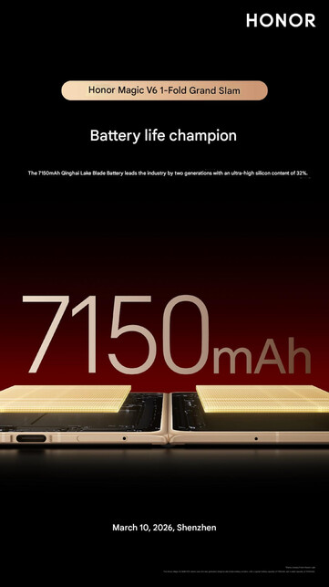 Niet alleen dat, maar het bedrijf heeft ook bevestigd dat de Chinese variant geleverd zal worden met een grotere batterij dan zijn wereldwijde tegenhanger. Zoals de afbeelding hieronder laat zien, zal de Magic V6 voorzien zijn van een 7.150 mAh batterij in plaats van de 6.600 mAh gecombineerde capaciteit van zijn wereldwijde broer of zus. Volgens recente lekken zal de Magic V6 in China voor sommige SKU's echter een gecombineerde capaciteit van 6.850 mAh hebben.