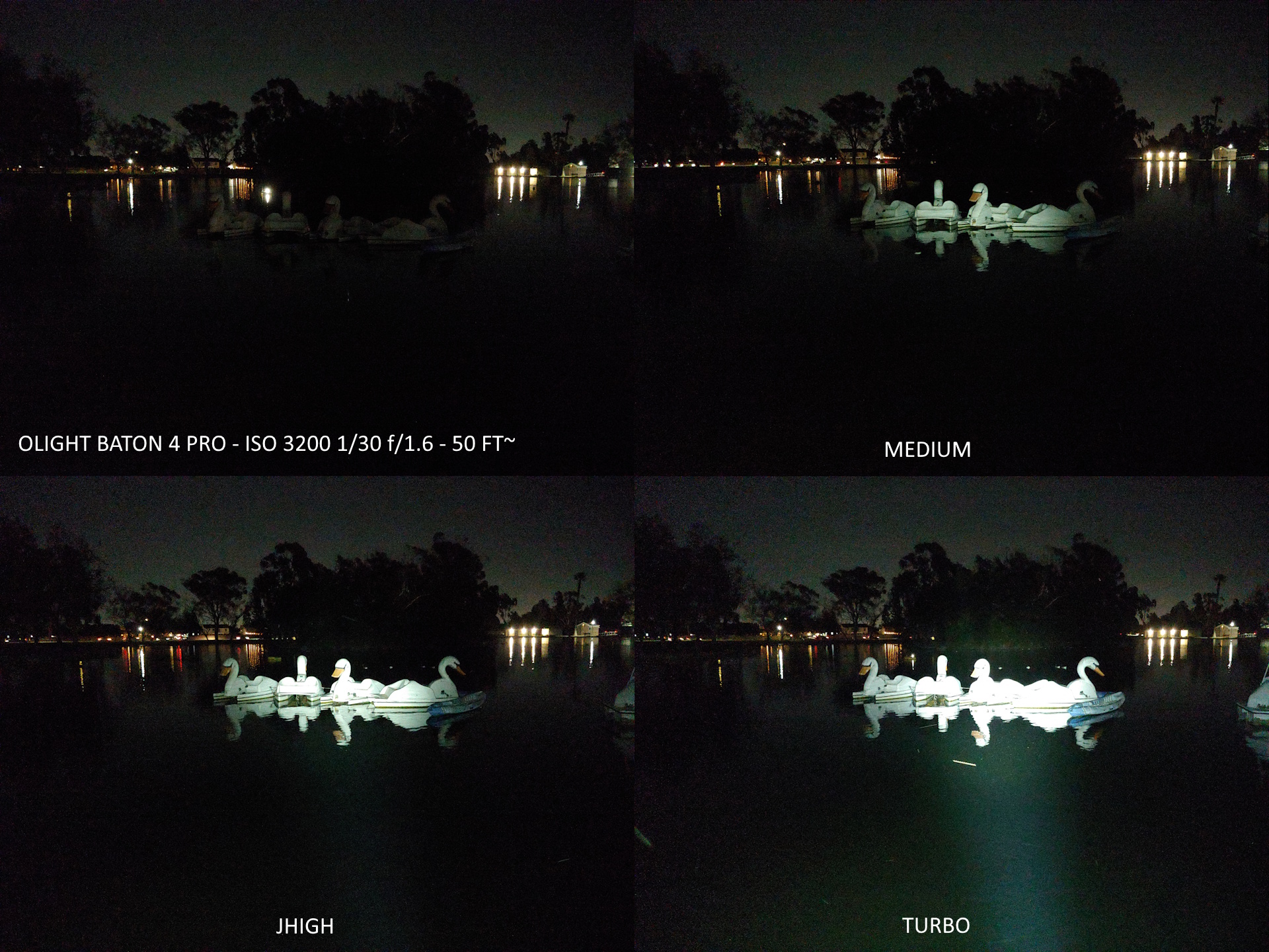De Batons werden getest in hun drie helderste standen. De zwanenboten liggen op een afstand van ongeveer 15 meter.