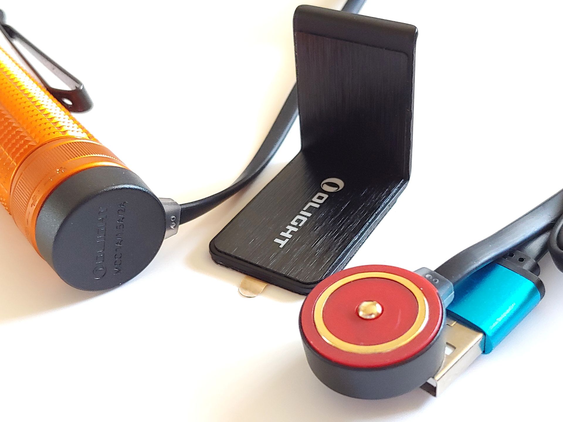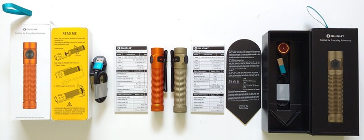 De stevige dozen bevatten een zaklamp met een lees-mij-kaart, een handleiding en een magnetische oplader. Een L-vormige stalen beugel met plakband wordt meegeleverd als dockingstation voor de zaklamp.