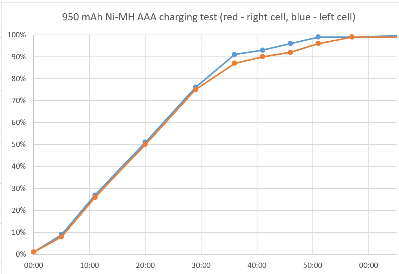 De oplaadsnelheid van AA-paren was merkbaar ongelijkmatig, waarbij de ene cel sneller oplaadde dan de andere. Bij het opladen van paren zal het apparaat de cel die het eerst klaar is niet uitwerpen. Opgeladen cellen voelden licht warm aan.