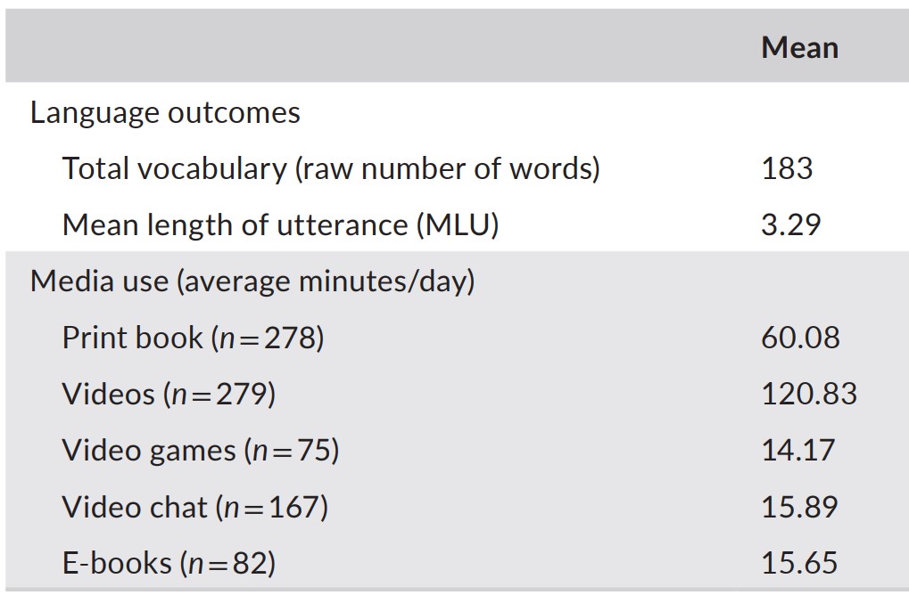 Een groep onderzoekers onder leiding van S. Kucker van de Southern Methodist University in Texas onderzocht de manier waarop verschillende media werden gebruikt door ouders van jonge kinderen versus taalontwikkeling. Verzorgers van 302 kinderen werden gerekruteerd om verslag uit te brengen over de dagelijkse media-activiteiten van hun kinderen en de redenen voor het gebruik ervan.