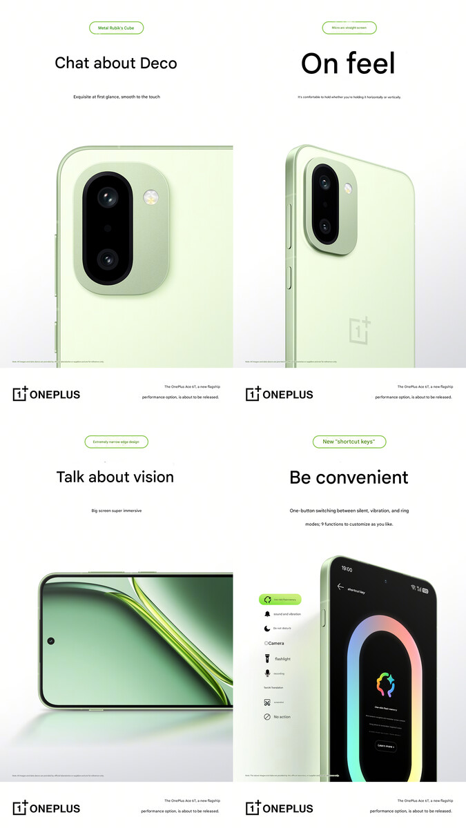 Daarnaast hebben de foto's bevestigd dat de OnePlus Ace 6T zal worden geleverd met een dubbele camera-opstelling aan de achterkant, met een camera-eiland dat er net zo uitziet als dat van de OnePlus 15. Het merk heeft dit niet bevestigd. Hoewel het merk het nog niet heeft bevestigd, zullen deze twee naar verwachting 50 MP sensoren zullen zijn. Het bedrijf heeft wel bevestigd dat de telefoon een recht scherm en een lichtgewicht ontwerp zal hebben.