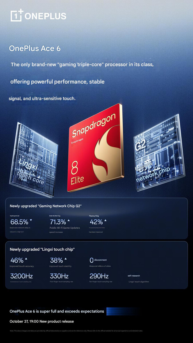 Nu heeft OnePlus bevestigd dat de Ace 6 vertrouwt op Qualcomm's Snapdragon 8 Elite chipset, net als de OnePlus 13 ervoor. Bovendien heeft de Ace 6 een verbeterde Gaming Network Chip G2, die volgens OnePlus betere mobiele en Wi-Fi-prestaties levert dan eerdere exemplaren. Ook beschikt het toestel over een Lingxi Touch Chip om de reactiesnelheid van het touchscreen tijdens het gamen te maximaliseren.