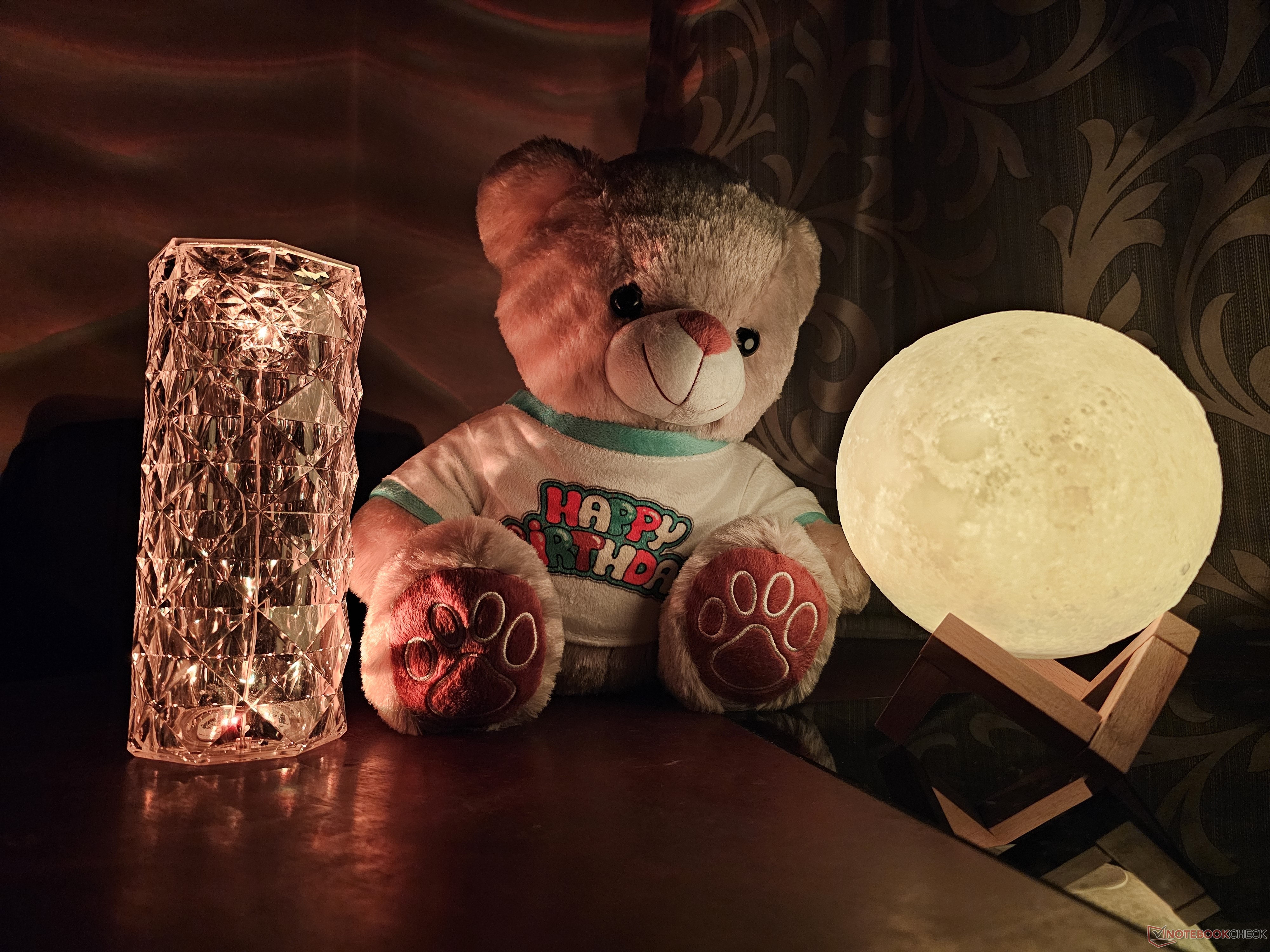 Foto's bij weinig licht zijn verrassend goed op de Nord 3 met weinig ruis en een goede resolutie van details zoals de vacht van de teddybeer en tekst op zijn shirt.