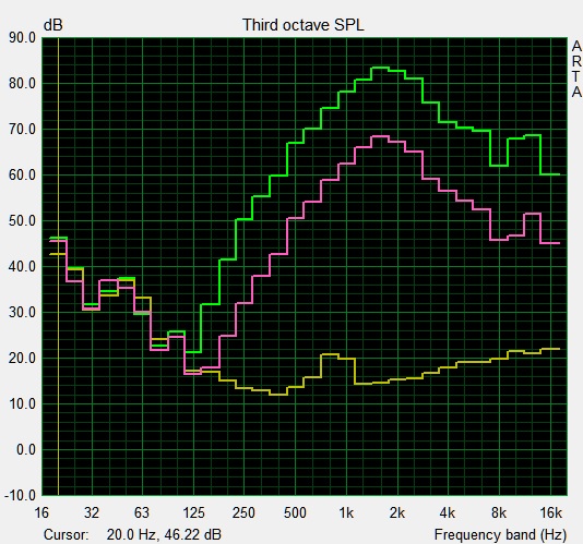 (-) | het totale geluid is niet lineair (115.2% verschil met de mediaan)