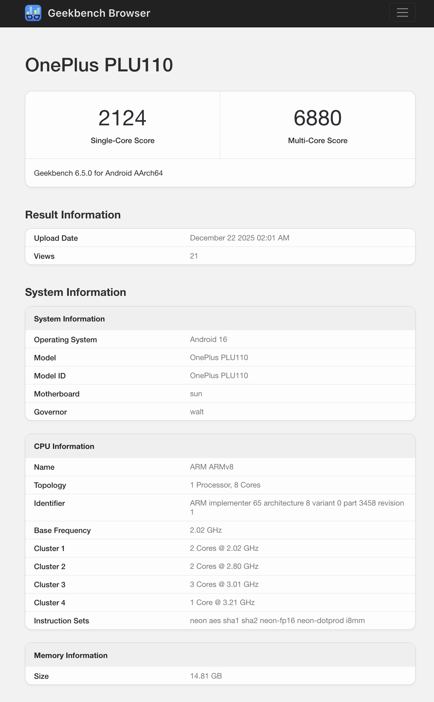 Hoewel Geekbench de verkoopnaam van het toestel niet bevestigt, wordt aangenomen dat PLU110 de onaangekondigde OnePlus Turbo is. Volgens beide vermeldingen beschikt de OnePlus Turbo over 16 GB RAM en Qualcomm's recente Snapdragon 8s Gen 4 chipset. Gevonden op de Niets Telefoon (3) en Poco F7 (momenteel $ 529,99 op Amazon), de Snapdragon 8s Gen 4 maakt gebruik van een enkele ARM Cortex-X4 chipset geklokt op 3,2 GHz.