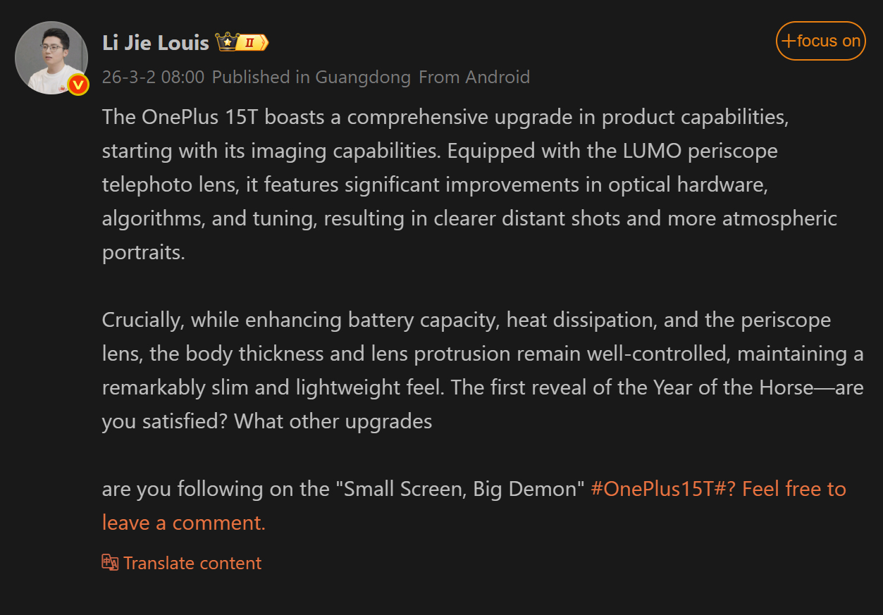 In een recente post op Weibo deelde Louis dat de aankomende compacte telefoon de LUMO periscoop telelens. Dankzij de upgrade van het algoritme, de optische hardware en de afstemming, zal de OnePlus 15T naar verluidt duidelijkere afstandsfoto's en gedetailleerde portretten bieden.