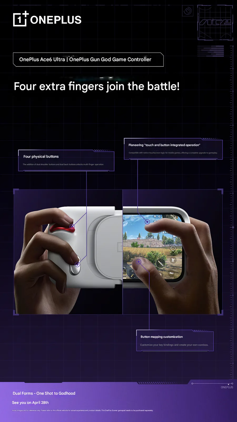 Het accessoire voegt vier fysieke knoppen toe en stimuleert hybride besturing: aanraken en knoppen. OnePlus laat zien dat gamers, met de controller bevestigd, gemakkelijk meerdere vingers kunnen gebruiken om schietspellen te spelen op de Ace 6 Ultra. Deze opzet, zoals de video's laten zien, maakt het gemakkelijker om complexe FPS-acties uit te voeren, zoals gluren, richten, schieten en tegelijkertijd de terugslag controleren.