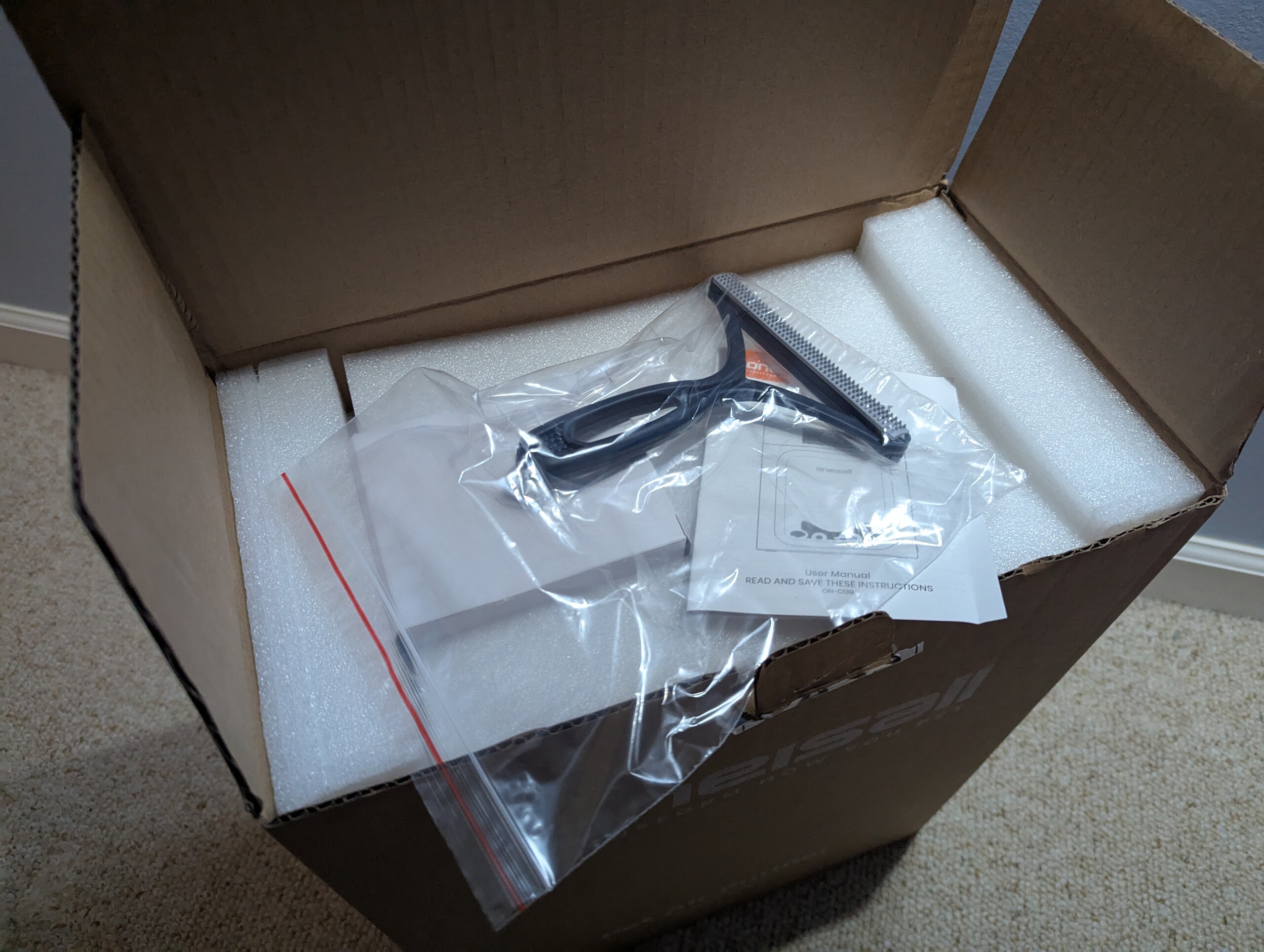 De Oneisall PP02 werd geleverd in een minimale verpakking met alles verpakt in plastic. Het pakket bevat de hoofdeenheid, de dubbele filtersets (vooraf geïnstalleerd) en een speciale pluizenborstel. De borstel was een leuke toevoeging en kan gebruikers helpen om de wasbare voorfilters te onderhouden en de levensduur van de primaire HEPA-filters te verlengen.