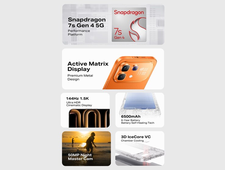 Op het frame is een sluitertoets voor de camera zichtbaar, die sterk doet denken aan de aanraakgevoelige Capture Button op de iPhone 17, hoewel details over de functionaliteit ervan nog niet bekend zijn. De Infinix Note 60 Pro wordt aangedreven door de Qualcomm Snapdragon 7s Gen 4met vier ARM Cortex-A720 prestatiekernen en vier Cortex-A520 efficiëntiekernen.