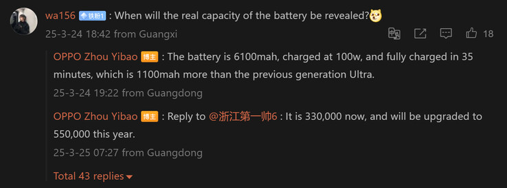 Zoals de bedrijfsfunctionaris in de commentaarsectie van die specifieke Weibo-post onthulde, zal de Oppo Find X8 Ultra een 6.100 mAh batterij hebben, die 1.100 mAh groter is dan de voorganger. Deze capaciteit is ook hoger dan de Xiaomi 15 Ultra, de directe concurrent van de X8 Ultra met een 5.410 mAh batterij.