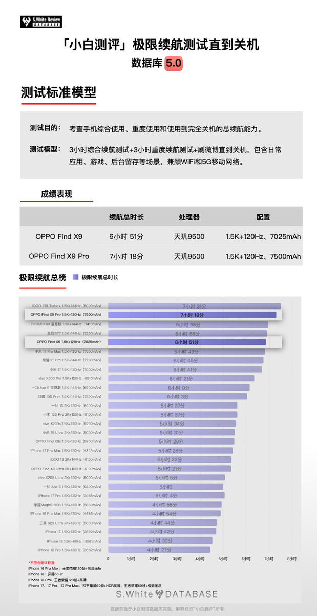 De Find X9 Pro haalt in de test een totale tijd van 7u18m en verliest het alleen van de iQOO Z10 Turbo+, die 7u31m meegaat. De Oppo heeft een batterij van 7.500 mAh, net als de Xiaomi 17 Pro Max-terwijl de iQOO een batterij van 8.000 mAh heeft. Xiaomi's twijfelachtige batterijprestaties worden nog eens benadrukt door het feit dat de vanille Find X9 6u51m meegaat tegenover de 6u49m van de Xiaomi 17 Pro Max, ondanks de kleinere 7.025 mAh batterij. Hierbij moet wel opgemerkt worden dat de Find X9 ook het kleinere toestel van de twee is. De iPhone 17 Pro Max 5u26m mee.
