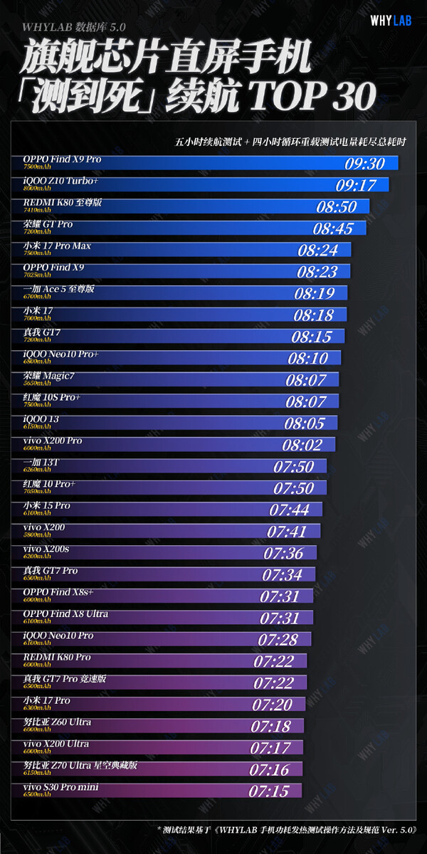 Een vergelijkbare reeks tests door WhyLab levert identieke resultaten op. De Find X9 Pro komt als beste uit de bus met een totale tijd van 9u30m, terwijl de Xiaomi 17 Pro Max slechts 8u24m meegaat.