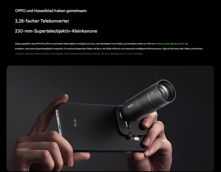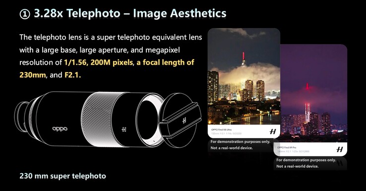 Deze telefotocamera heeft een 35mm-equivalente brandpuntsafstand van 70mm en een diafragma van f/2.1. Voor degenen die nog meer bereik willen, biedt Oppo een optionele telefotoconverter die de brandpuntsafstand van de periscoop-telescamera effectief vergroot tot 230 mm (35 mm-equivalent), waardoor de smartphone 10x optische zoom heeft.