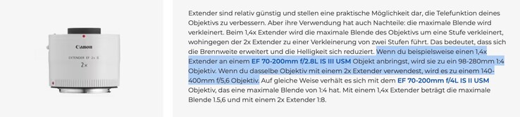 Camerafabrikanten zoals Canon laten zien dat marketing ook eerlijker kan zijn. Als het gaat om teleconverters voor systeemcamera's, leggen ze over het algemeen duidelijk uit hoe de converter de brandpuntsafstand en het diafragma van een objectief beïnvloedt. Een 70 mm f/2.8 lens wordt bijvoorbeeld een 98 mm f/4 lens met een 1,4x teleconverter, maar een 140 mm f/5.6 lens met een 2x converter. Dus voor een tweevoudige zoom verliest u twee volle f-stops licht.