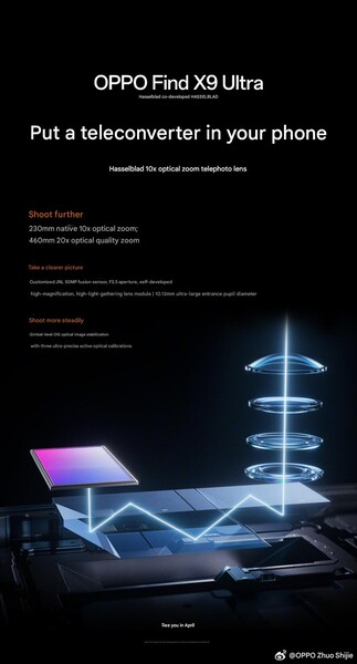 Hoewel externe lenzen - zoals teleconverters die zijn ontworpen voor de Vivo X200 Ultra of X300 Pro - geweldige prestaties leveren, vereisen ze meestal een speciale behuizing en extra apparatuur om mee te nemen als u opnamen van hoge kwaliteit wilt maken van onderwerpen op grote afstand. Gepland voor een wereldwijde lancering in aprilde aankomende Oppo Find X9 Ultra kan een aantrekkelijke optie zijn voor mensen die liever lichter reizen.