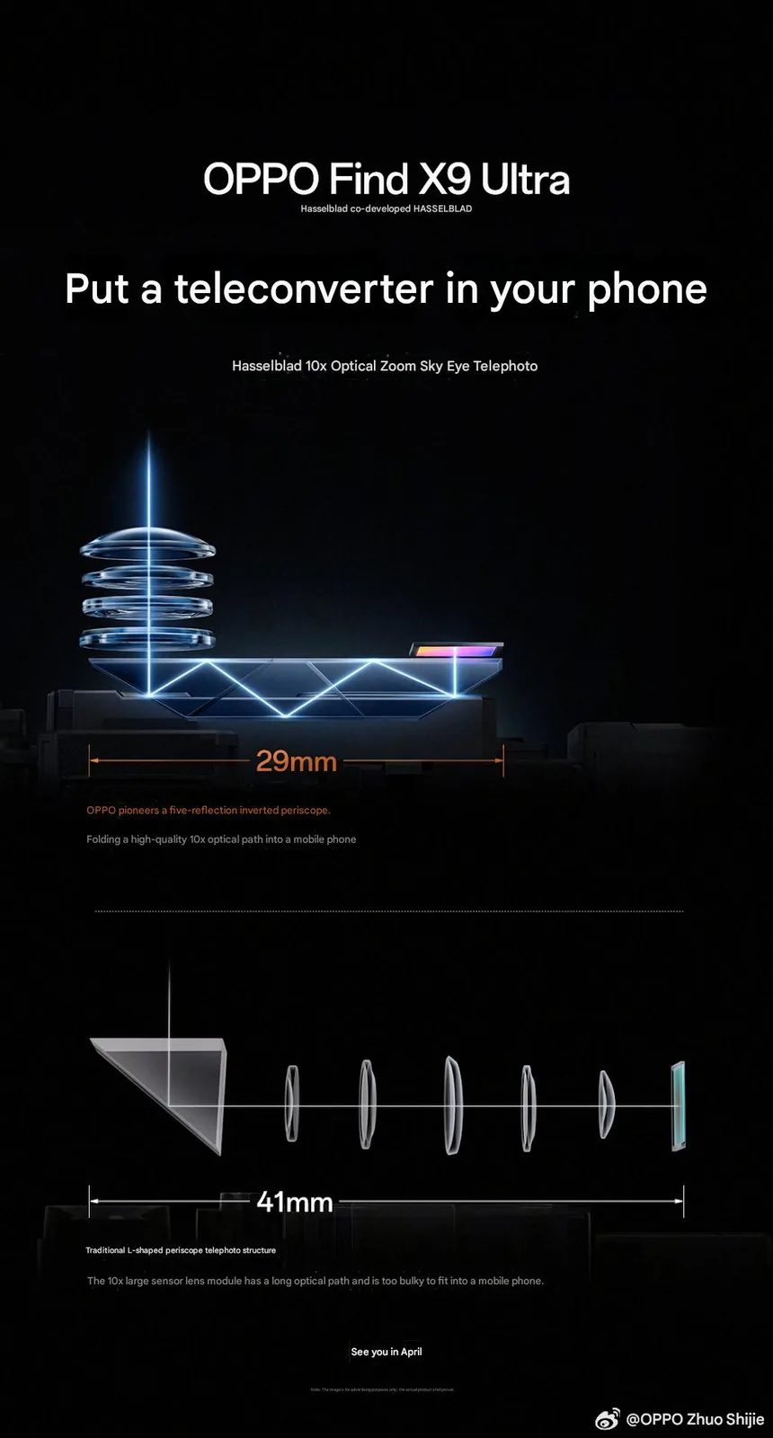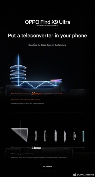 Oppo heeft voor het eerst officiële teasers gedeeld op Weibo en via Pete Lau op X om de geïntegreerde 10x zoommodule te laten zien. In China heeft het bedrijf een vrij gedetailleerde kijk gegeven op het ontwerp en de werkingsprincipes van het systeem. Oppo heeft een nieuwe spiegelsamenstelling opgenomen van slechts 29 mm lang, met een W-vormig lichtpad met vijf reflecties voor superieure optische prestaties bij een equivalente brandpuntsafstand van 230 mm