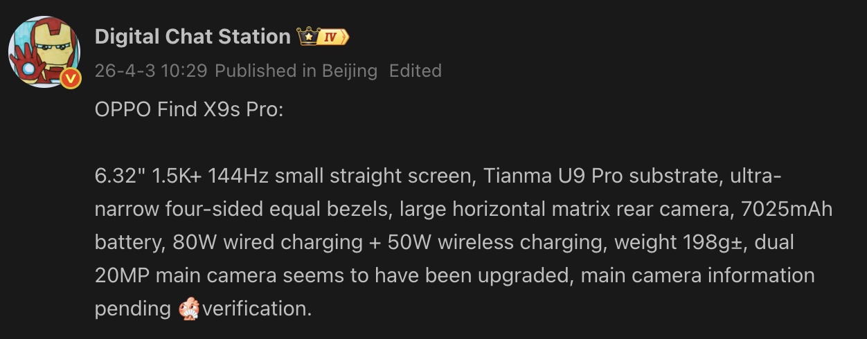 Volgens Digital Chat Station op de Chinese sociale mediasite Weibokrijgt de Oppo Find X9s Pro een 6,32 inch beeldscherm met een resolutie van ongeveer 1,5K en een vernieuwingsfrequentie van 144Hz. De tipgever heeft onthuld dat de telefoon gebruik zal maken van een Tianma U9 Pro paneel met smalle symmetrische randen.