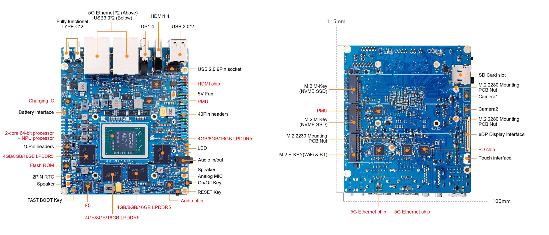 De Orange Pi 6 Plus is uitgerust met een SoC met twaalf kernen en afhankelijk van de configuratie heeft het LPDDR5-geheugen een capaciteit van 16, 32 of 64GB. Er zijn verschillende M.2 2280 slots voor SSD's beschikbaar, maar gebruikers kunnen ook een M.2 Key E kaart voor WiFi en Bluetooth installeren. Zoals gebruikelijk heeft deze single-board computer ook een SD-kaartlezer.